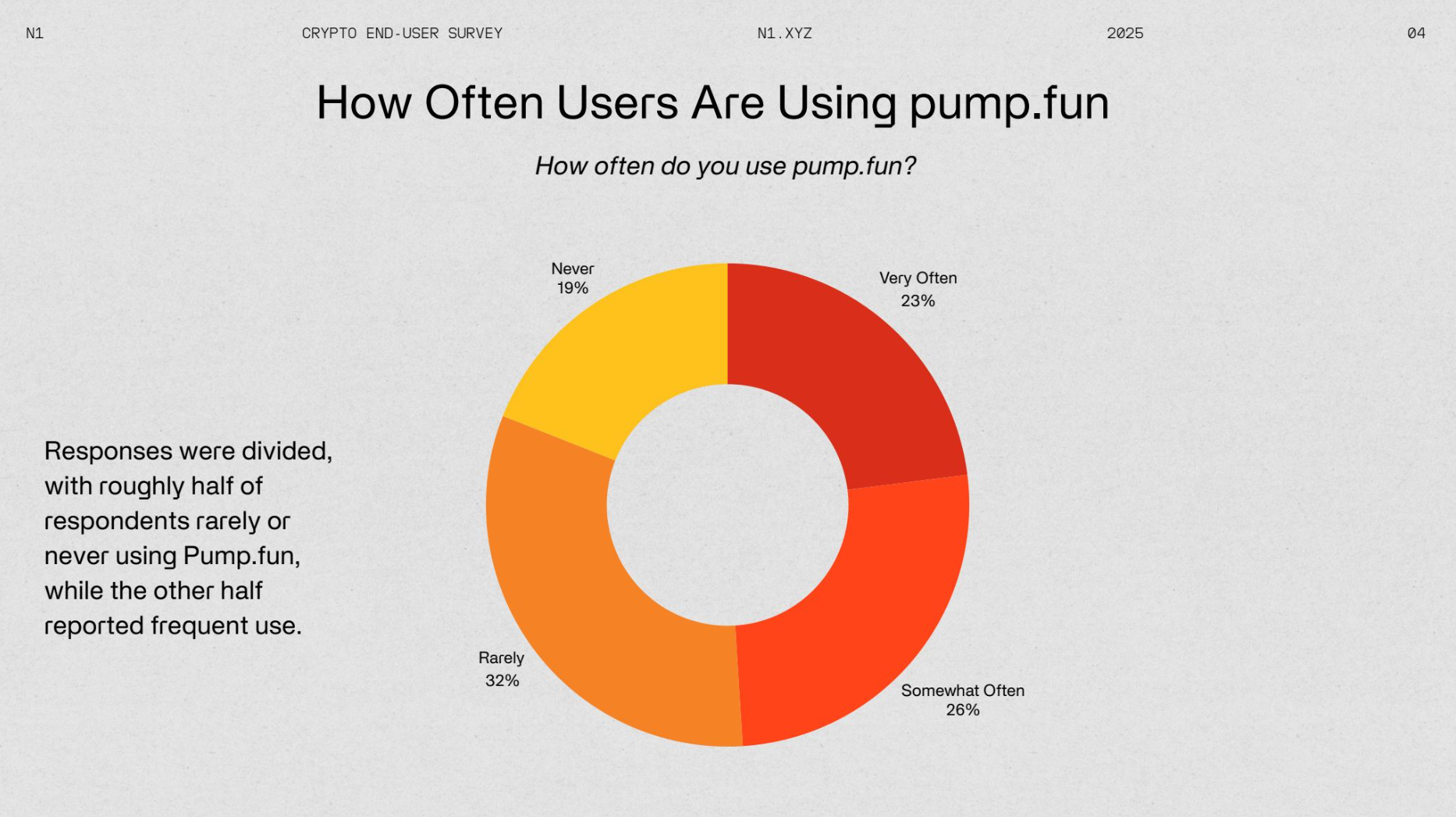 On-chain gaming remains niche—50% of users rarely play, while 15% play frequently. Meanwhile, Pump.fun, a popular memecoin trading app on Solana, has seen mixed adoption, with around 30% of users reporting rare usage.