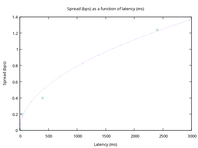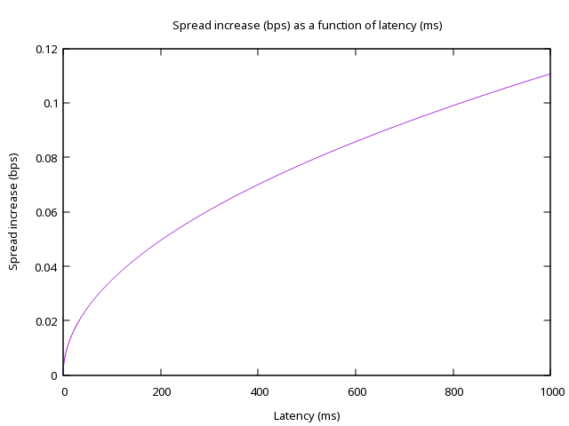 A couple of things to note. First of all, we have the right shape! Secondly, this graph should be taken with a grain of salt: spread depends on many more factors than latency. Importantly, we didn’t take into consideration the effects of competition, volume, fees, etc. Moreover, we actually had to fit the value of \(\sigma z\), since it turns out market makers are less generous than we were, and overestimated the volatility and increased z so \(\sigma z \approx 0.076 \text{bps} \cdot \text{ms}^{-1/2}\). We expected market makers to increase their spread proportionally to \(\sqrt{\Delta t}\), which is indeed what happens. The important bit is that it doesn’t matter if market makers are nice or generous or not, they cannot get around latency. If the latency increases, they have no choice but to increase spreads to the detriment of traders.