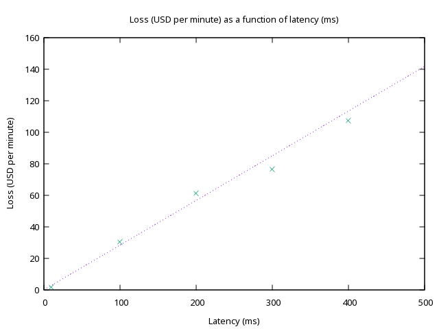 Let’s say an exchange wanted to subsidize market-making by offering incentives to offset the effects of latency on market-making spreads. How much would the exchange have to pay? Back-testing the effects of price movements on market-making strategies on BitMEX can give us an idea of how much money is lost to arbitraging. We expect the volume to be taken in that amount of time to be proportional to \(\sqrt{\Delta t}\), but also the size of orders grows further away from the index price. For higher latencies, we expect the loss to grow faster than the square root, maybe even linearly. Which is indeed what we observe.