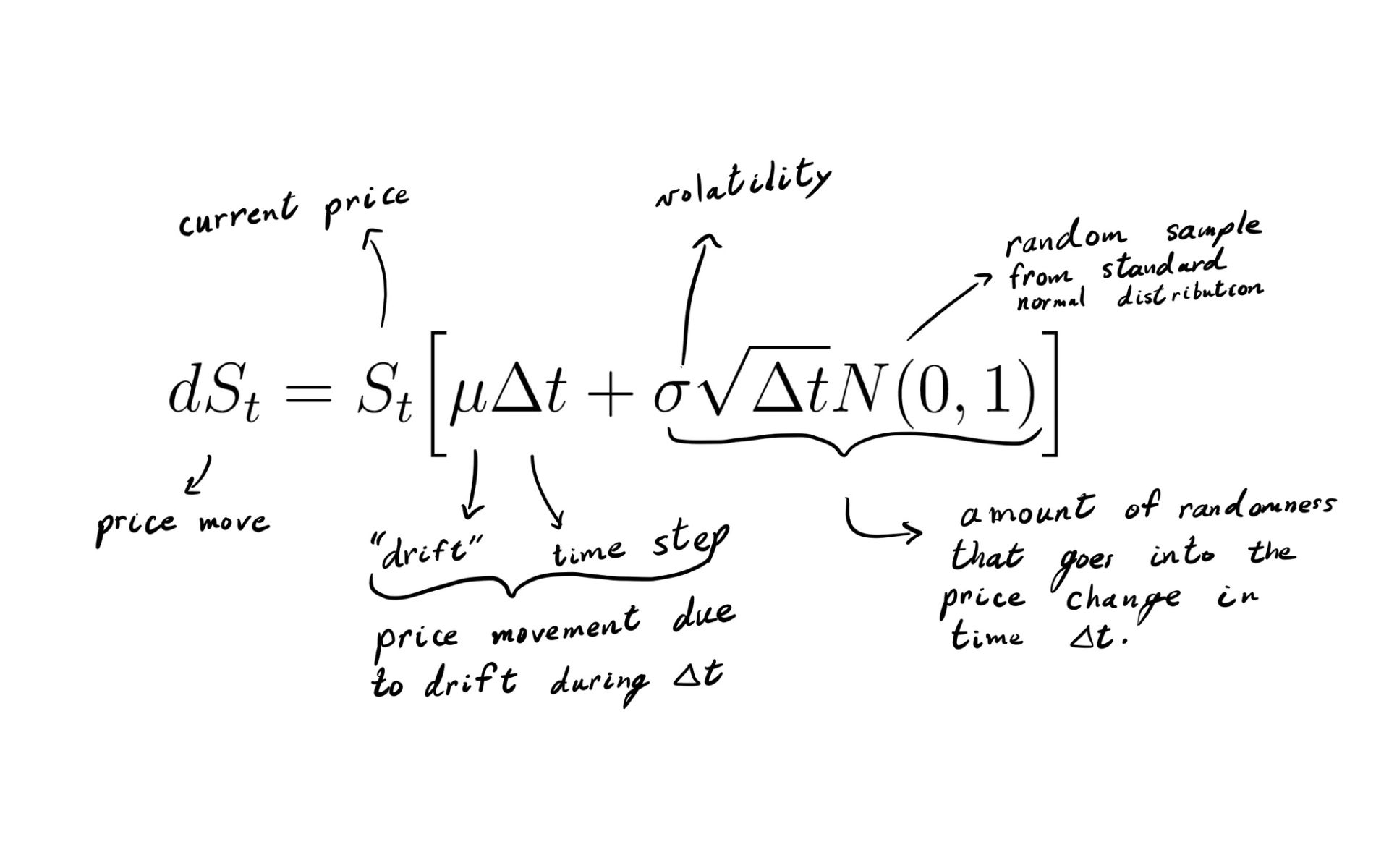 In words, the proportional change \(dS_t / S_t\) is related to a term which predicts a constant growth for each elapsed second, \(\mu \Delta t\) , and a random term, \(\sigma \sqrt{\Delta t} N(0, 1)\). Again, N(0,1) is the [standard normal distribution](https://en.wikipedia.org/wiki/Normal_distribution). (Formally, the random term is \(\sigma \sqrt{\Delta t} X\), where \(X \sim N(0, 1)\), or X is normally distributed. It is a random value sampled from the normal distribution.) Stocks typically have long-tailed distributions, i.e. not normal, but the normal distribution will suffice for our calculations.